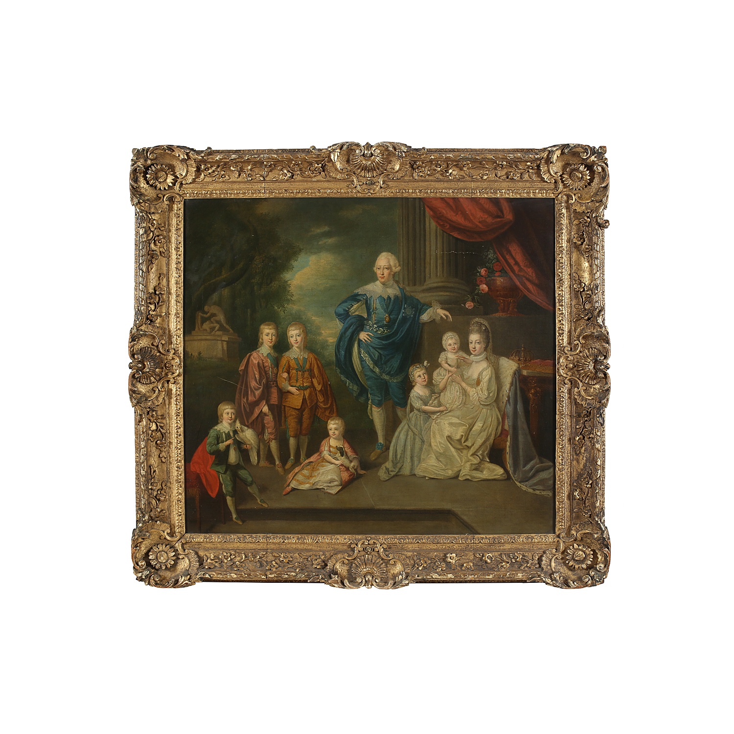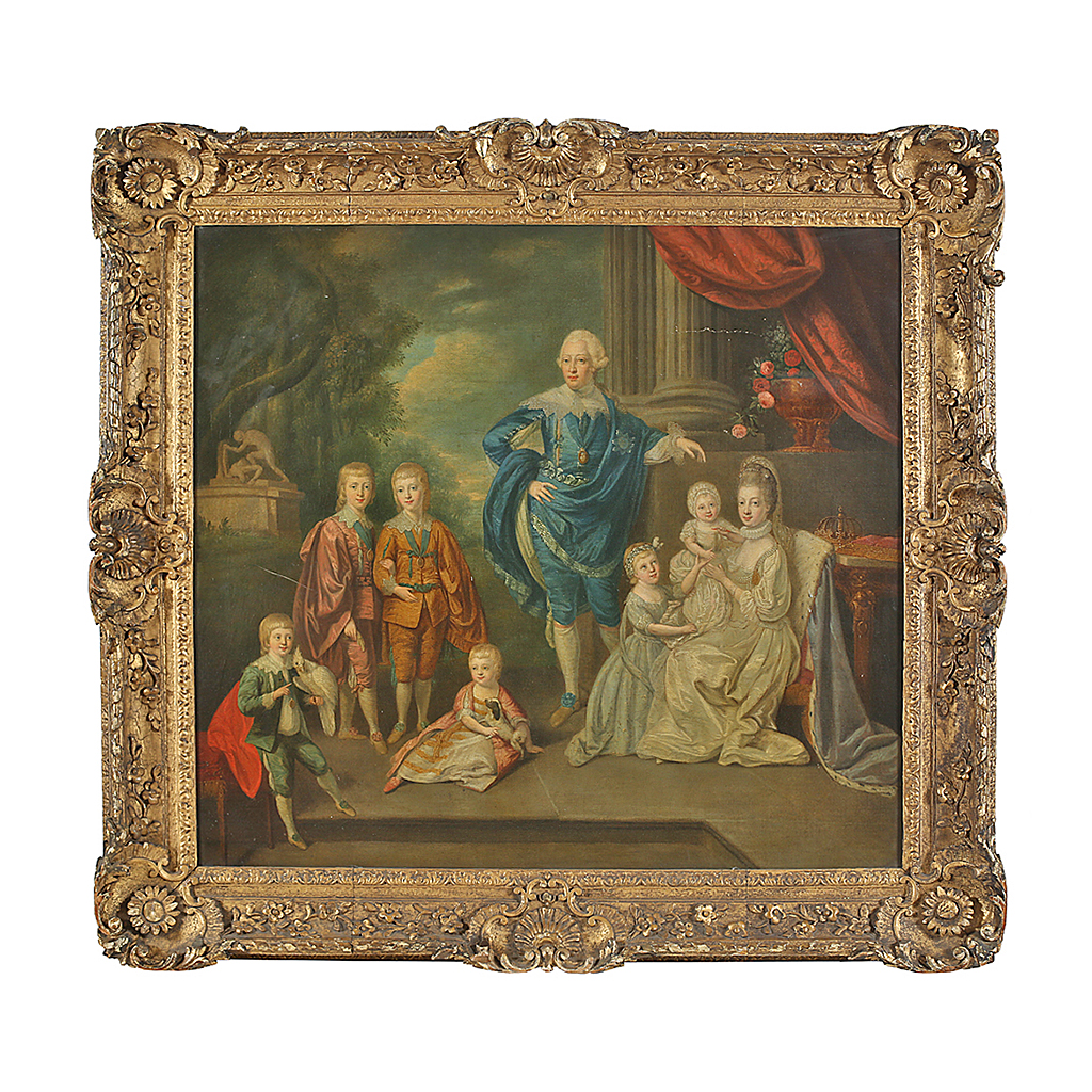 OIL PAINTING 32" X 36" ROYALTY GROUP PORTRAIT OF GEORGE III QUEEN CHARLOTTE AND THEIR SIX ELDEST CHILDREN AFTER JOHAN ZOFFANY 1770 IN A FINE CARVED GILT SWEPT CORNER AND CENTRE FRAME